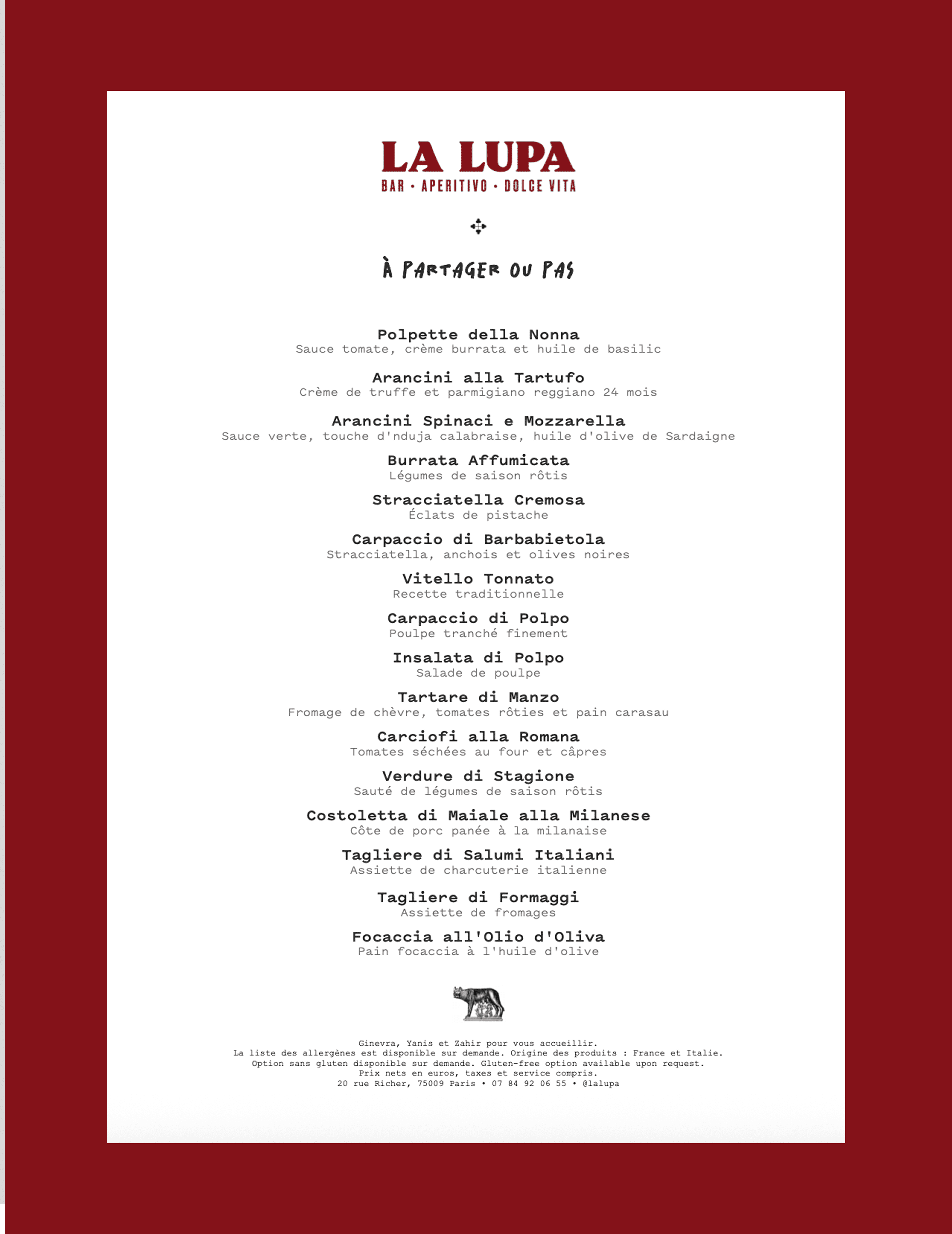 Le soir, La Lupa se met à l’heure de l’aperitivo et des grandes tablées italiennes.
